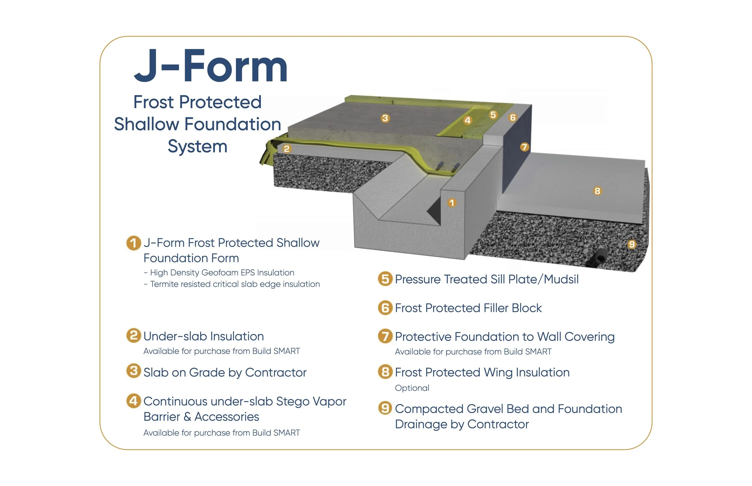 J-form is Build Smart’s proprietary Frost-protected shallow foundation system. J-form makes it unnecessary to form and pour frost footings. Insulation and air barriers are completely integrated with the E-Wall Building Envelope System. Our J-form allows for condensed construction schedules and superior insulation strategy.